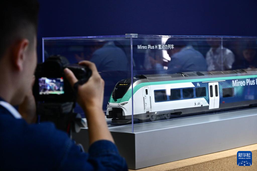 9月18日,一名参观者在2025中国国际城市轨道交通展览会上拍摄氢动力列车模型。