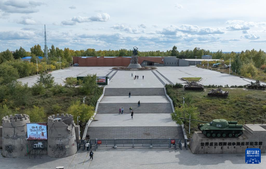 9月18日,人们在内蒙古呼伦贝尔市海拉尔区世界反法西斯战争海拉尔纪念园参观(无人机照片)。