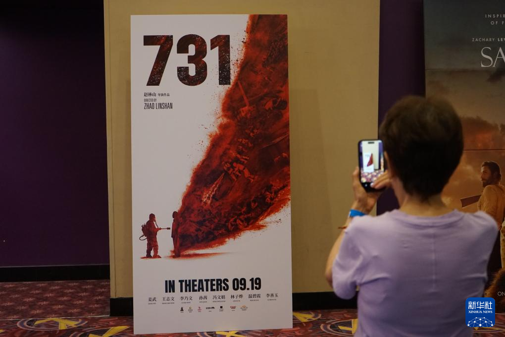 9月18日,在美国洛杉矶地区,观众在影院拍摄电影《731》海报。