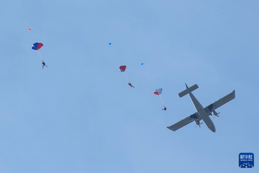 9月19日,2025年空军航空开放活动和长春航空展上,空军航空大学“蓝鹰”跳伞队进行表演。