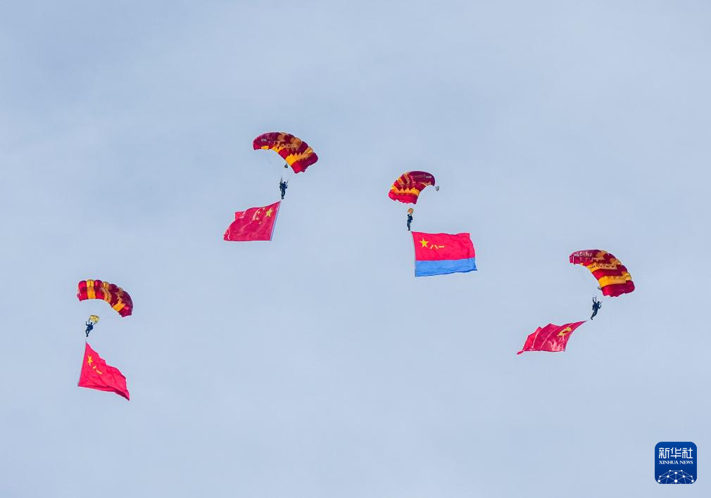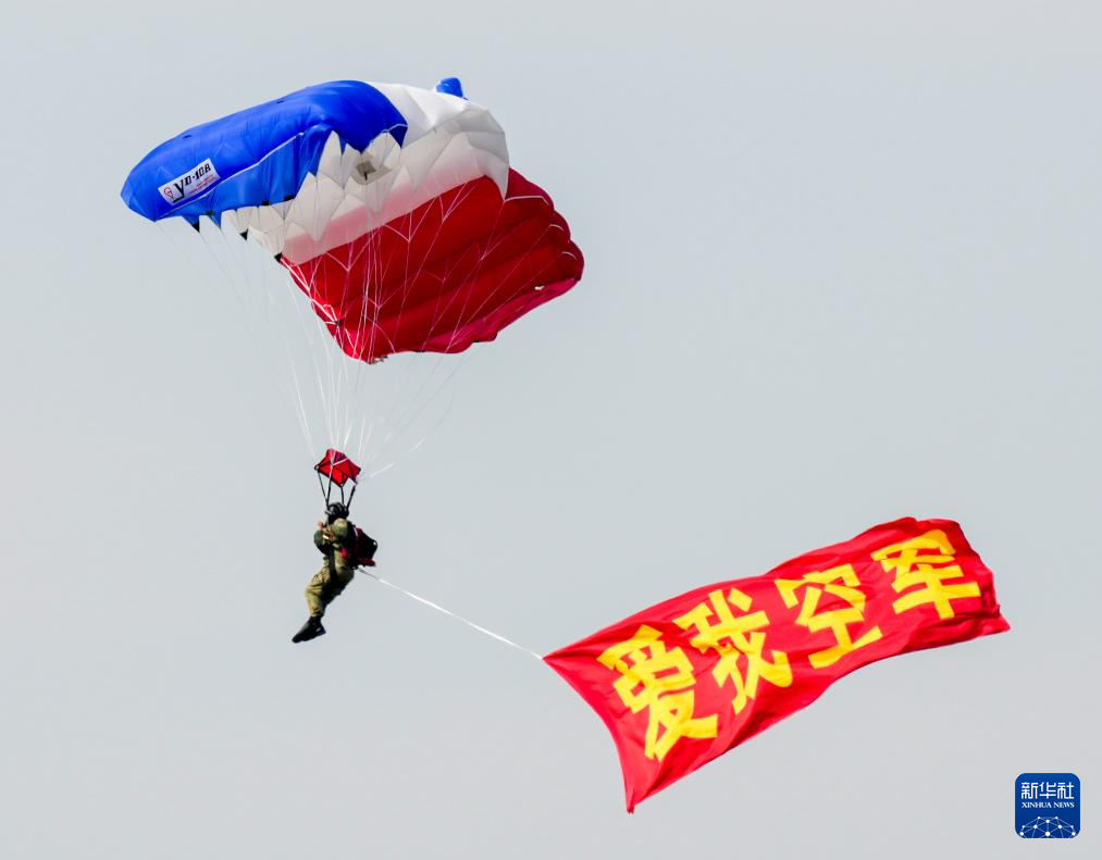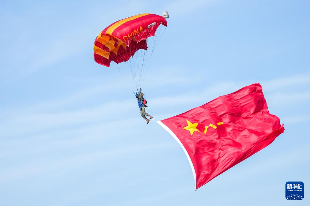 9月19日,空军航空大学“蓝鹰”跳伞队进行表演。