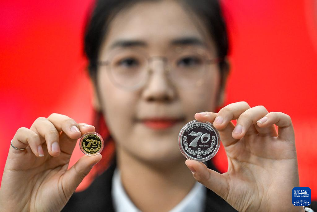 这是9月19日拍摄的新疆维吾尔自治区成立70周年金银纪念币。