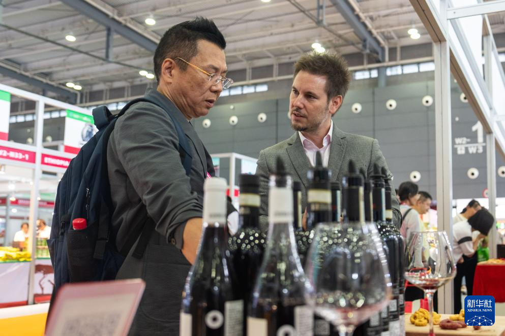 9月19日,在长沙国际会展中心,参展商(右)在介绍展出的红酒。