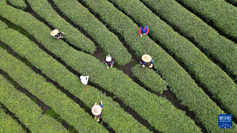 广西三江侗族自治县八江镇布央村茶农在茶园采茶(2025年3月21日摄,无人机照片)。