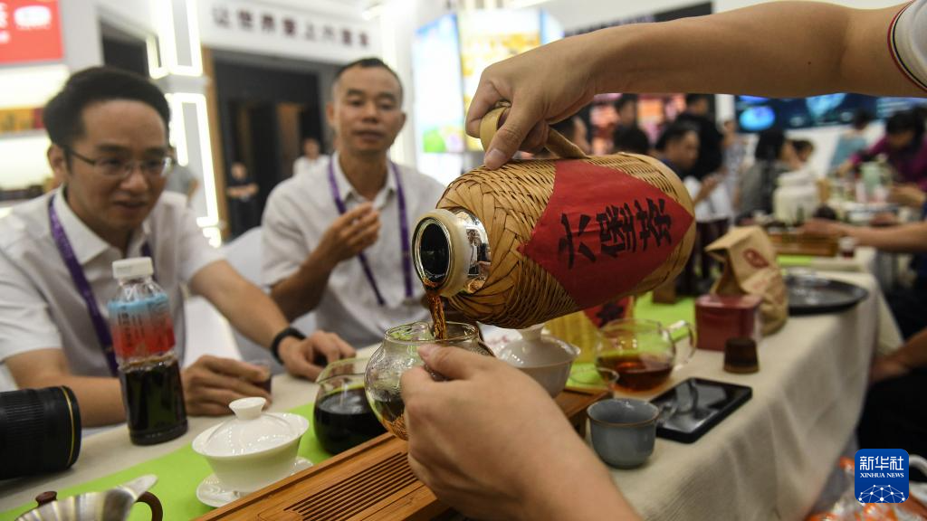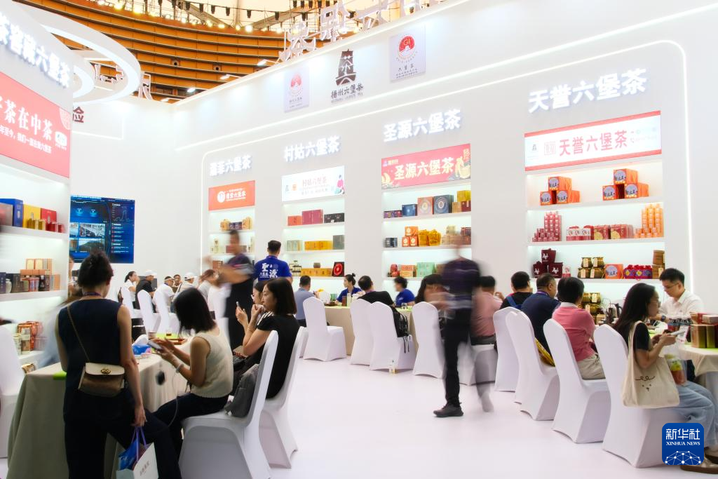 在南宁国际会展中心六堡茶展区,参观者在品茶选茶(2025年9月18日摄)。