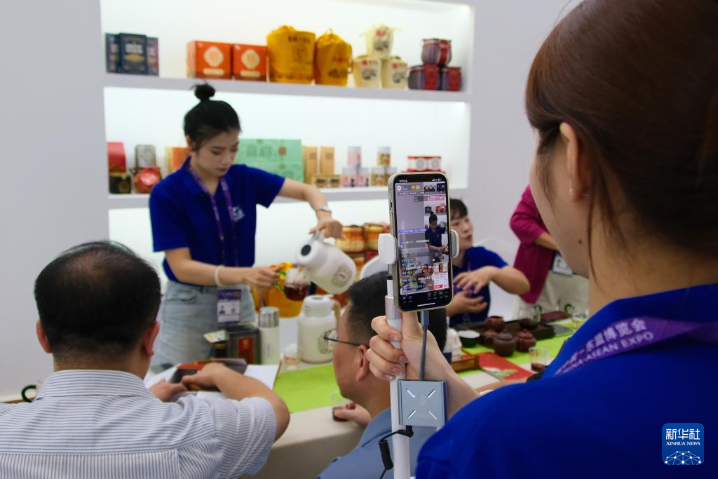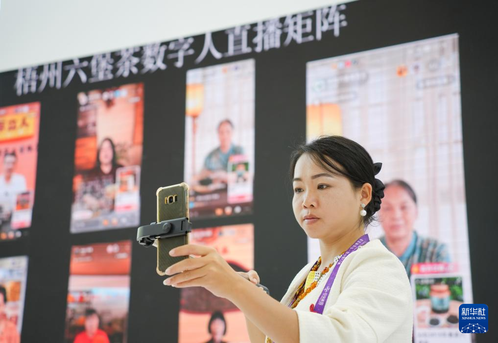 在广西南宁国际会展中心六堡茶展区,茶企工作人员在通过网络直播推销六堡茶(2025年9月17日摄)。