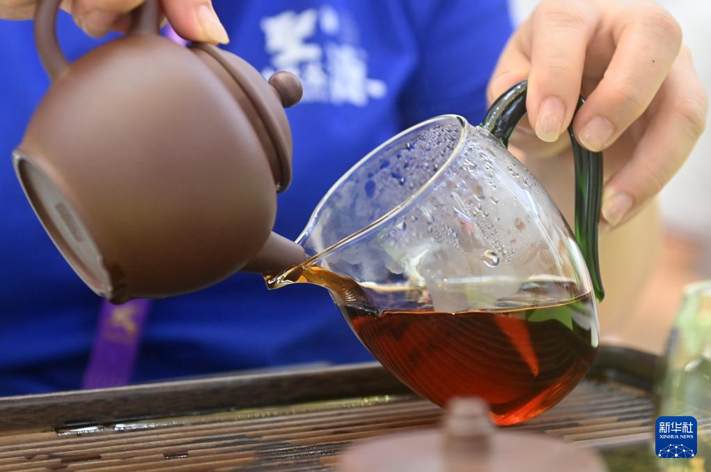 在广西南宁国际会展中心六堡茶展区,茶企工作人员在冲泡六堡茶(2025年9月17日摄)。