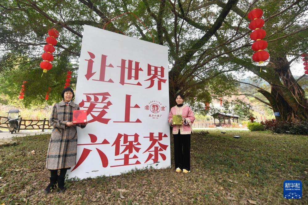在广西梧州市苍梧县六堡镇黑石山茶厂,六堡茶制作技艺国家级代表性传承人韦洁群(左)和女儿石濡菲在展示六堡茶(2025年2月21日摄)。