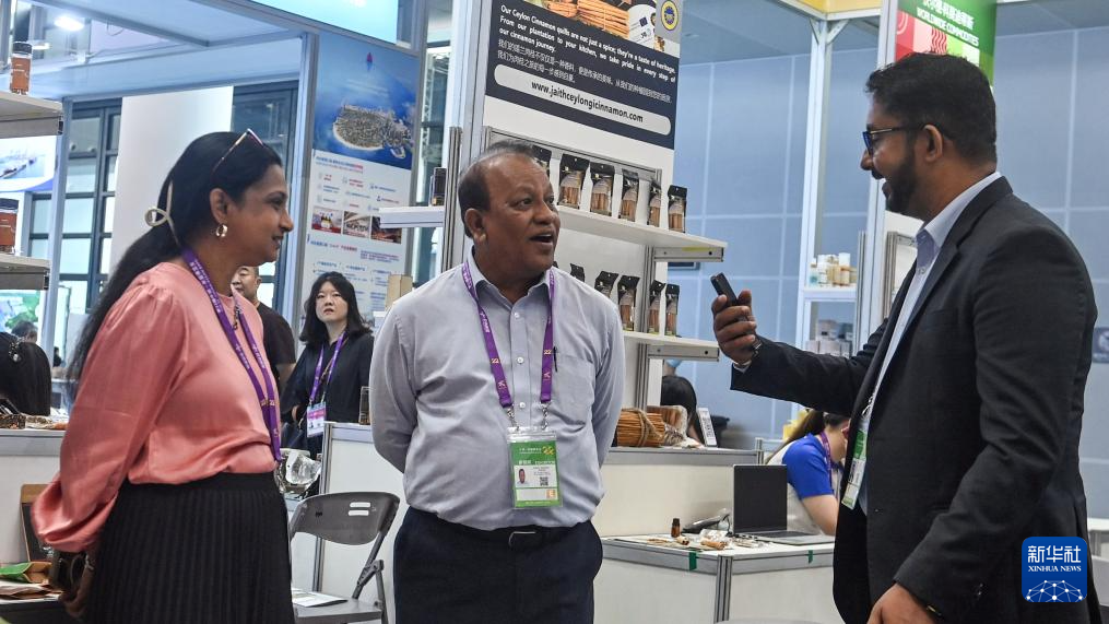 9月20日,在广西南宁国际会展中心斯里兰卡展馆,客商在洽谈合作事宜。