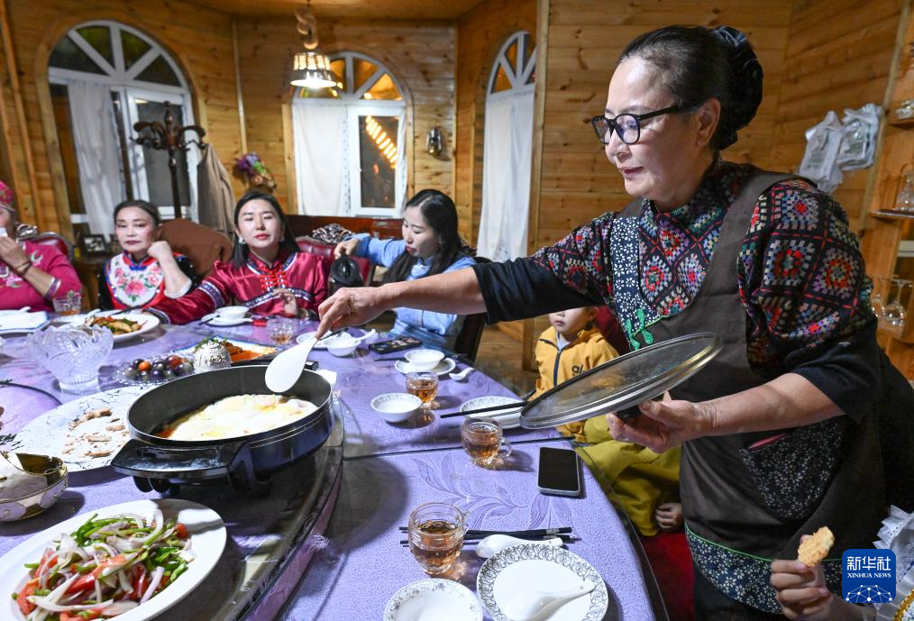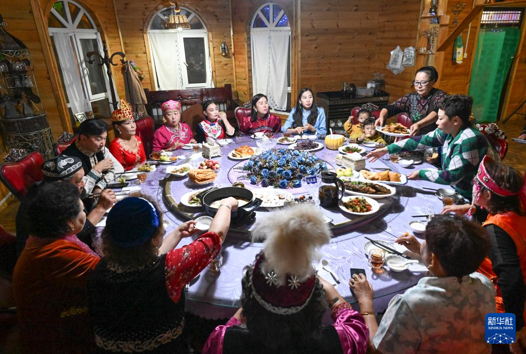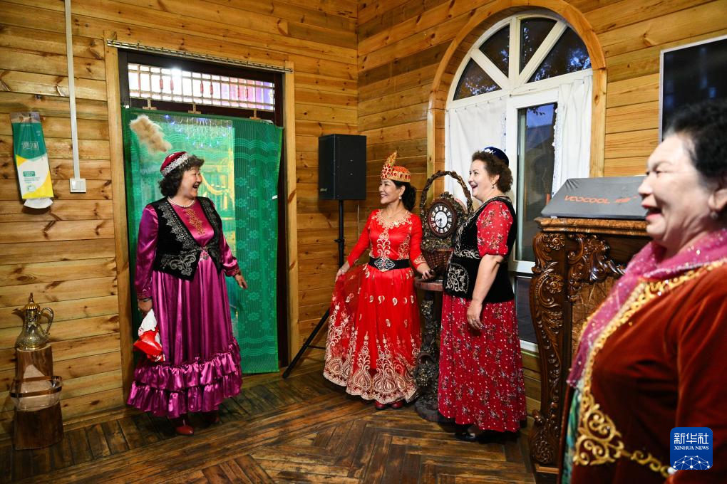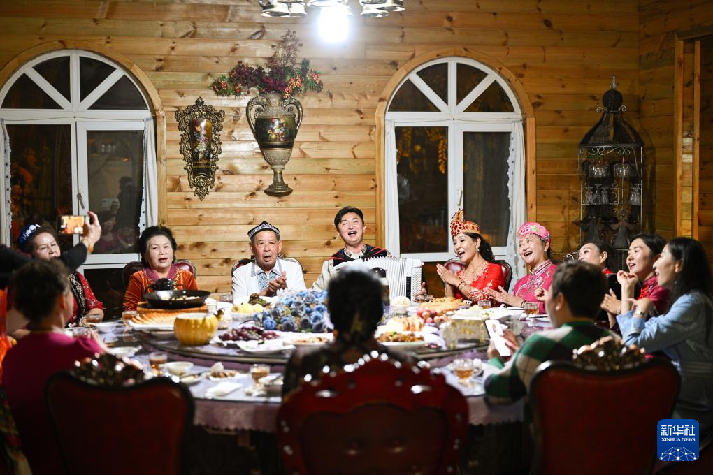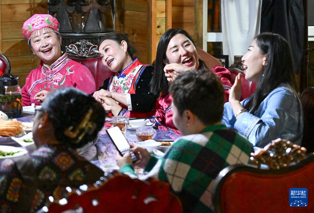 朋友们穿着民族服饰来到“朋友庄园”,马大姐招呼大家进屋就坐。亲朋好友拉着家常,品尝着马大姐的拿手菜和小院里结的新鲜水果。房间里飘扬起欢快的歌声,不同民族的亲友们在房间里共舞。