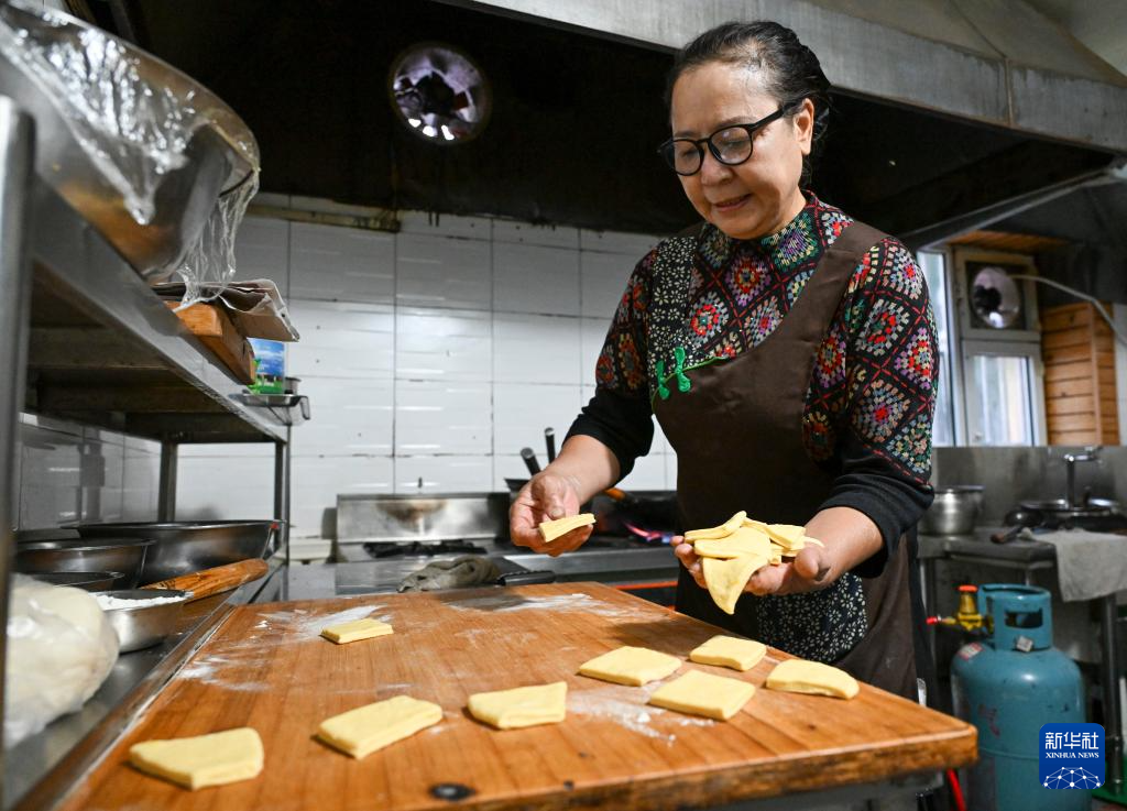 9月17日,马秀花在制作哈萨克族传统风味的包尔萨克。