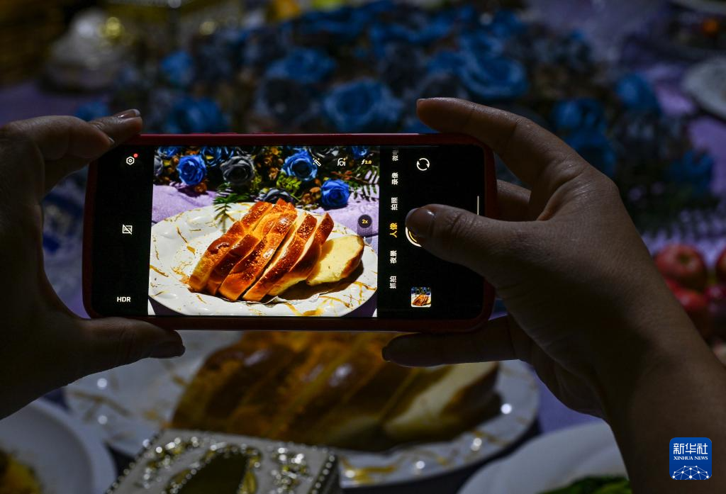 9月17日,一名客人在拍摄塔城地区特色的俄式风味大列巴。