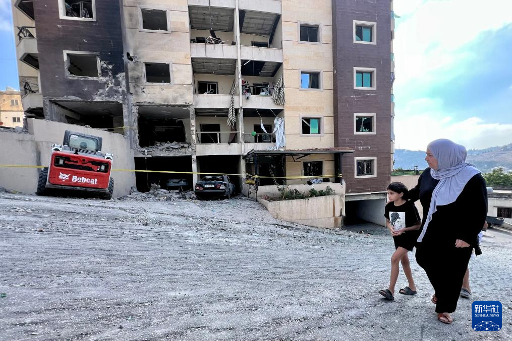 9月16日,在黎巴嫩奈拜提耶,一名妇女带着孩子从遭以军袭击后的建筑前走过。