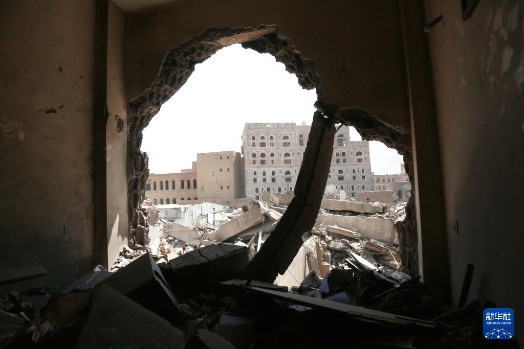 这是9月13日在也门首都萨那拍摄的遭以军空袭损毁的建筑。