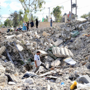 9月19日,在黎巴嫩南部布尔杰·卡拉维耶,居民在以色列空袭摧毁的房屋废墟中寻找家当。