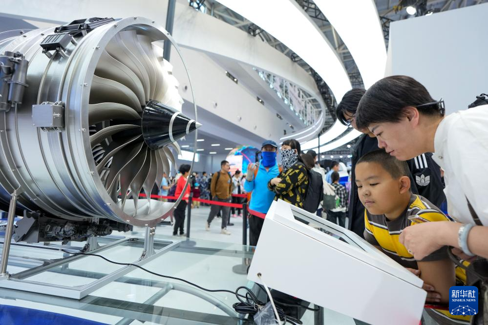 9月20日,参观者在现场观看涡扇发动机相关介绍。