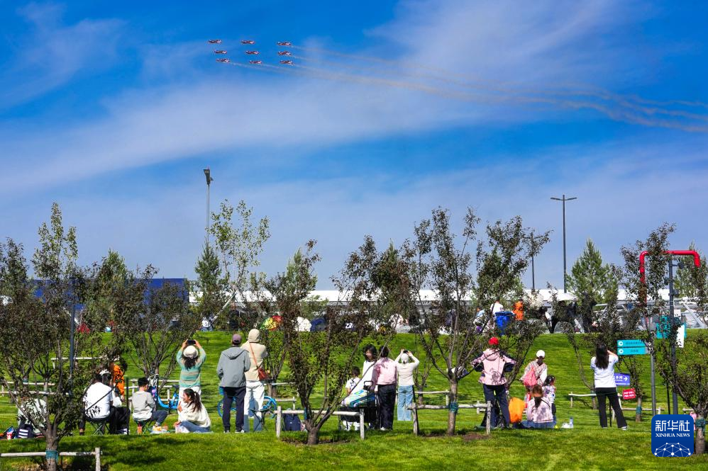 9月20日,参观者在长春市蓝天公园观赏飞行表演。