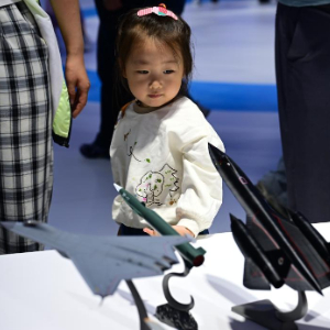 9月20日,小朋友在2025世界制造业大会上观看飞机模型。