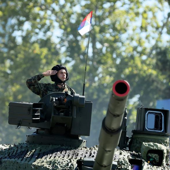 当地时间20日上午,塞尔维亚在首都贝尔格莱德市举行“团结的力量”阅兵式,纪念塞尔维亚统一、自由和国旗日。据塞国防部消息,此次阅兵共有近1万名士兵参与,共展示约2500件武器和军事装备,包括70架航空器、600辆军用车以及20艘舰船。
