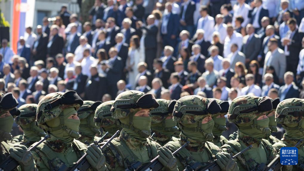 9月20日,在塞尔维亚首都贝尔格莱德,塞尔维亚士兵经过观礼台接受检阅。