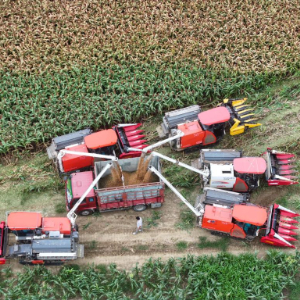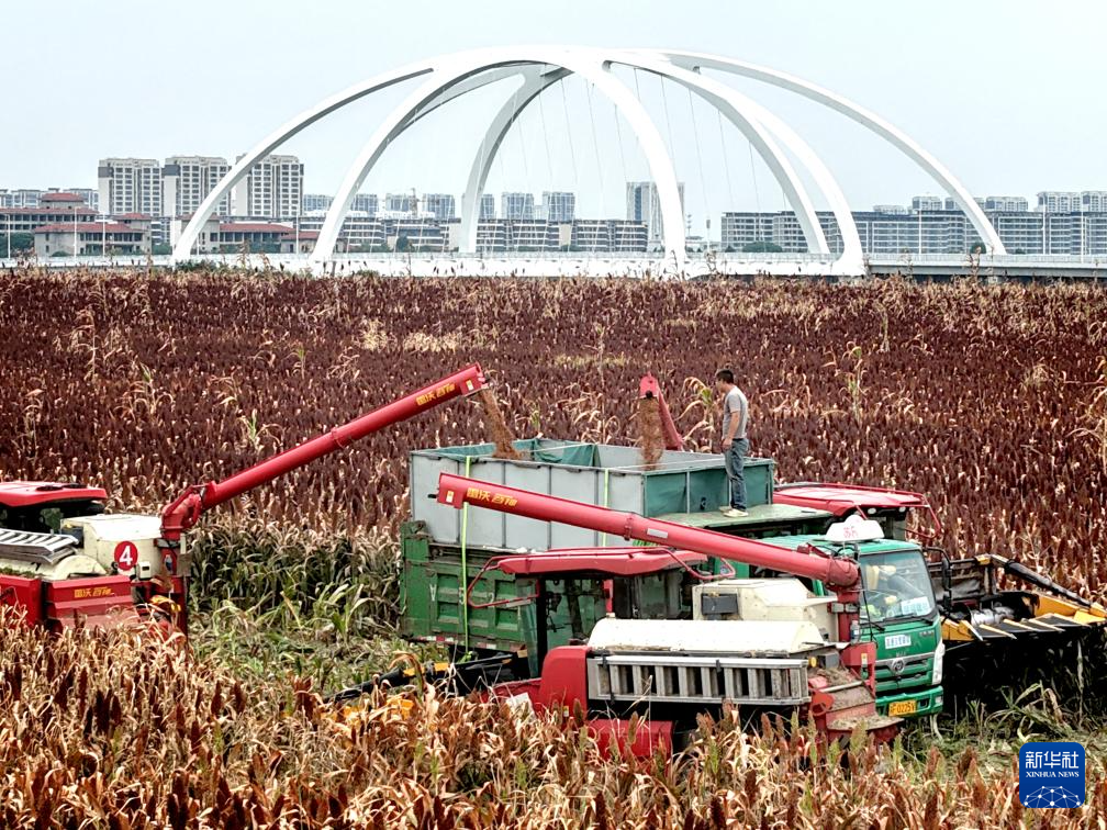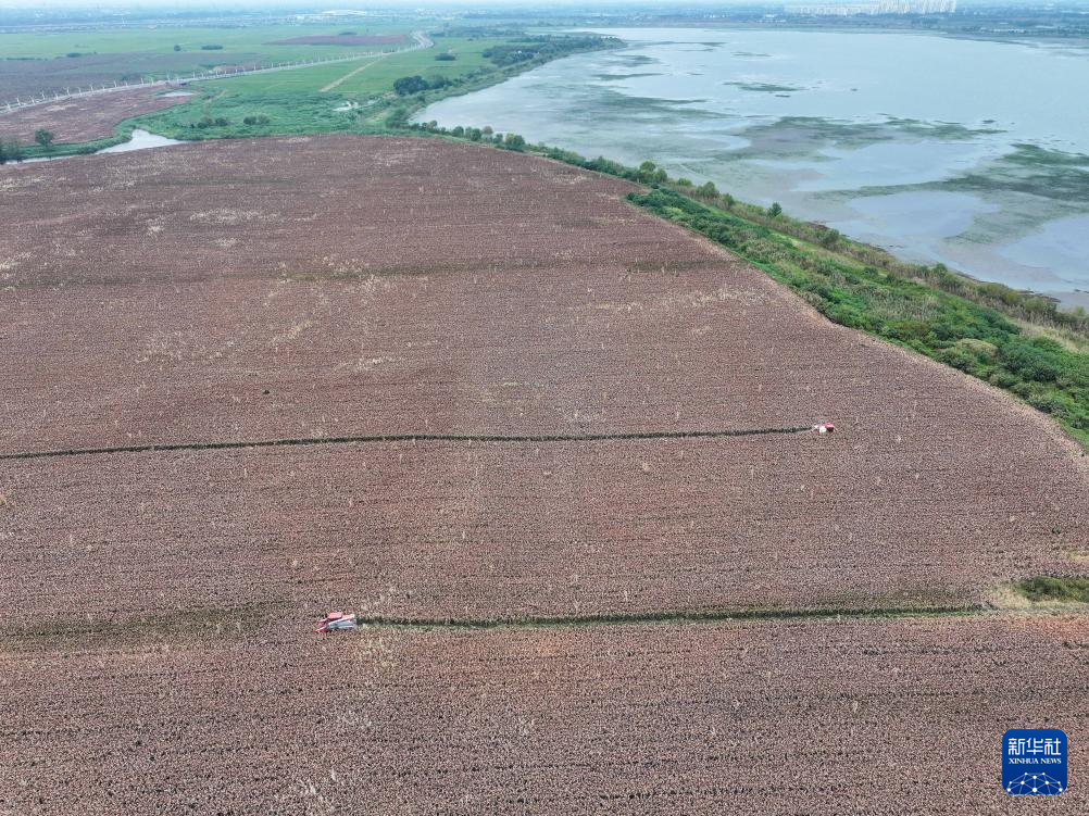9月21日,收割机在地里收割高粱(无人机照片)。