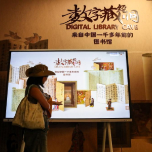9月22日,在敦煌研究院“典范”“高地”建设成果展上,一名嘉宾在观看莫高窟壁画彩塑保护修复工程简介。
