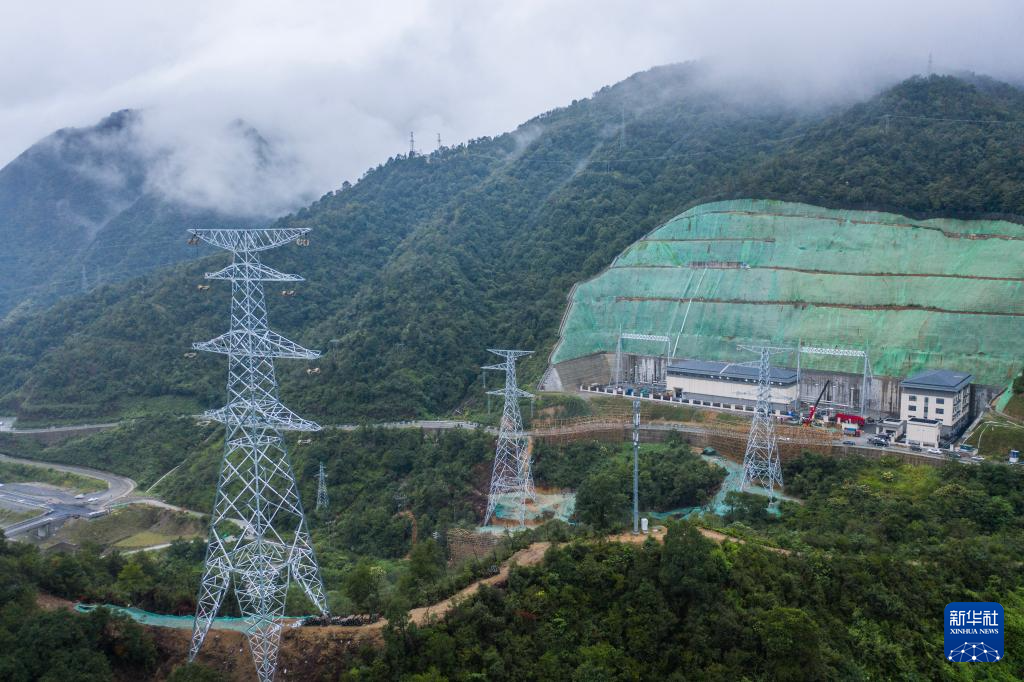 9月23日,浙江天台抽水蓄能电站的输电铁塔间在进行500千伏送出工程的输电线路架设施工(无人机照片)。