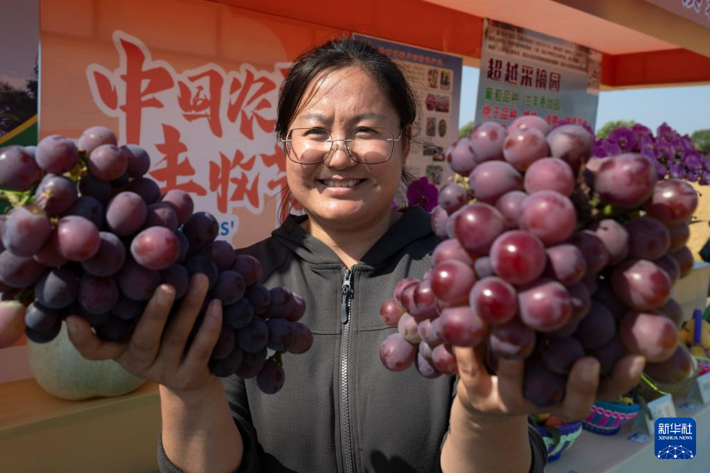 9月23日,农户在定制农业集中展销区展示丰收的葡萄。
