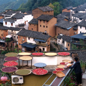阳产村山多地少,以种植山核桃、板栗、茶叶等为主。过去,村庄无人问津,村民多外出打工,成了“空心村”。近年来,当地政府依托土楼和“晒秋”特色,大力发展乡村旅游业。村民们当向导、开民宿、办起农家乐,吃上了旅游饭。