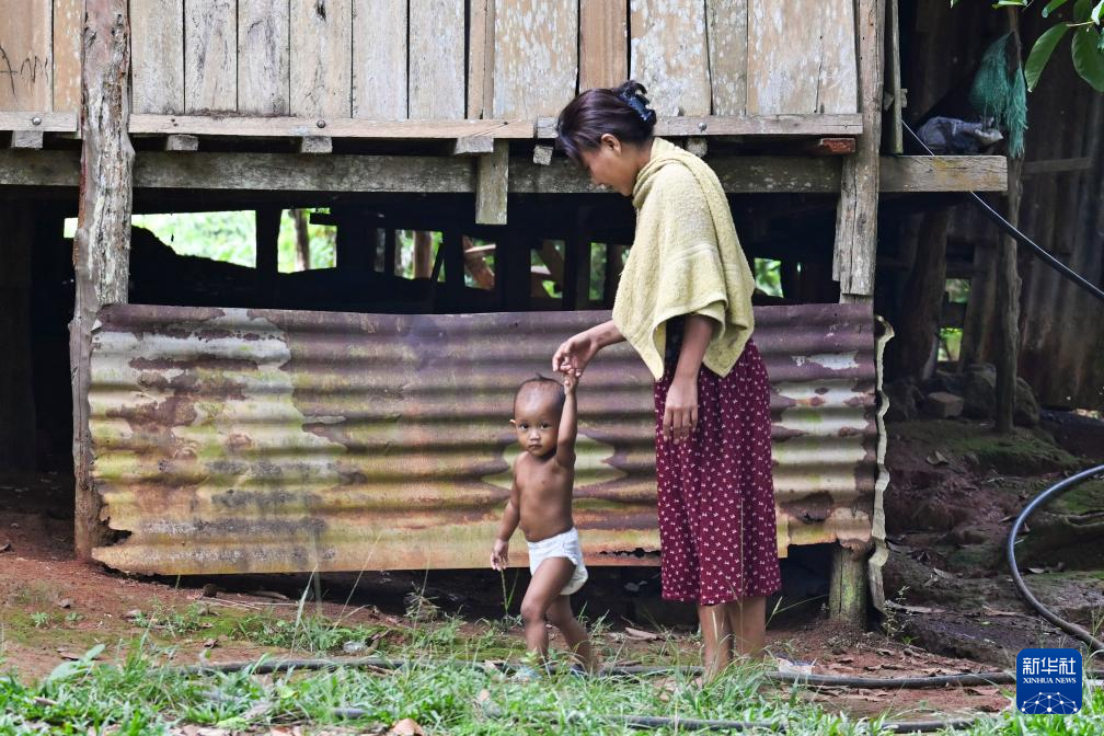 9月4日,在马来西亚彭亨州珍尼湖生物圈保护区丹戎普特村,一名贾昆女子牵着孩子。