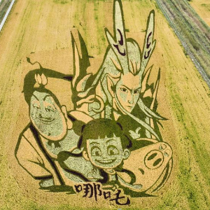 9月22日,一列火车经过内蒙古准格尔旗的稻田(无人机照片)。