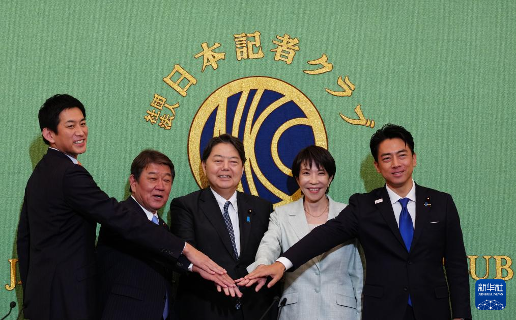 9月24日,在日本东京,日本自民党总裁选举候选人小林鹰之、茂木敏充、林芳正、高市早苗和小泉进次郎(从左至右)出席辩论会。