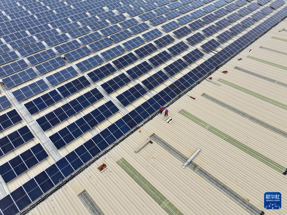 9月24日,国网泊头市供电公司工人在当地一家铸造企业屋顶巡检光伏发电设备。