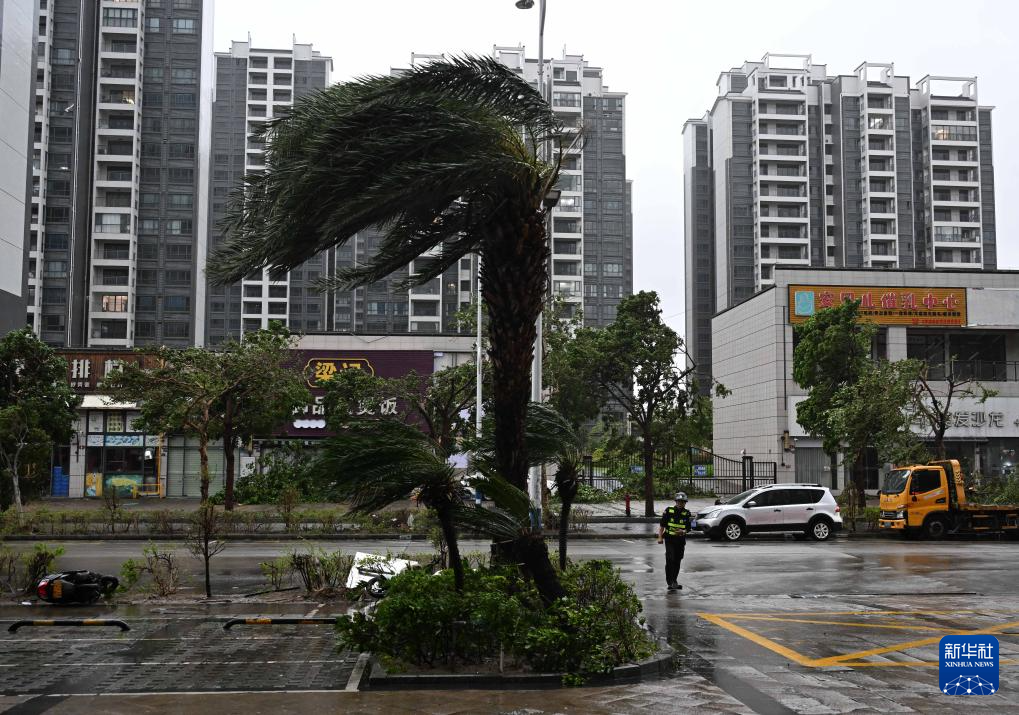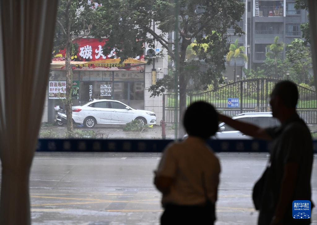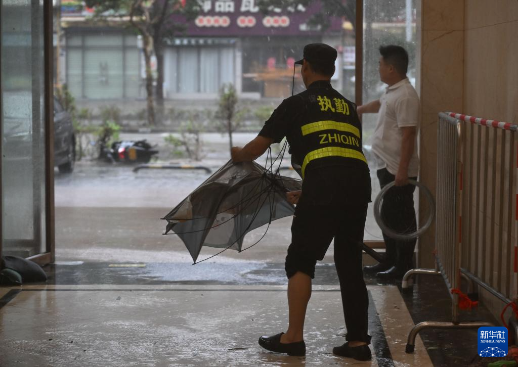 9月24日,在广东阳江市江城区横一路一家酒店外,保安查看设施损毁情况。