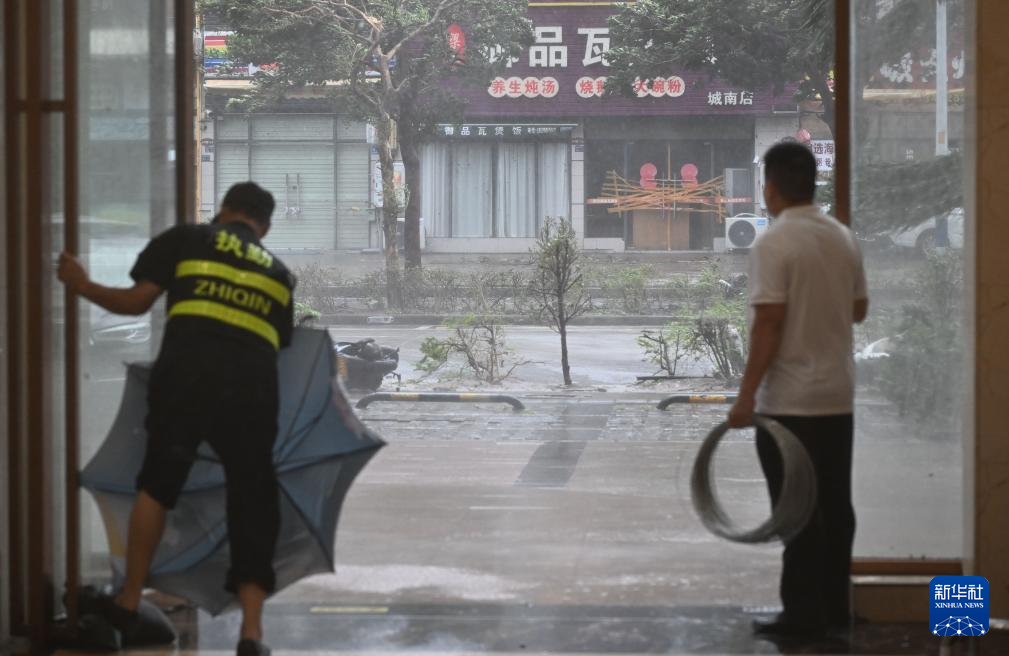 9月24日,广东阳江市江城区横一路一家酒店的工作人员在整理被风吹坏的雨伞。