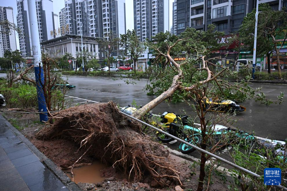 9月24日在广东阳江市江城区横一路拍摄的被风吹倒的大树和电动自行车。