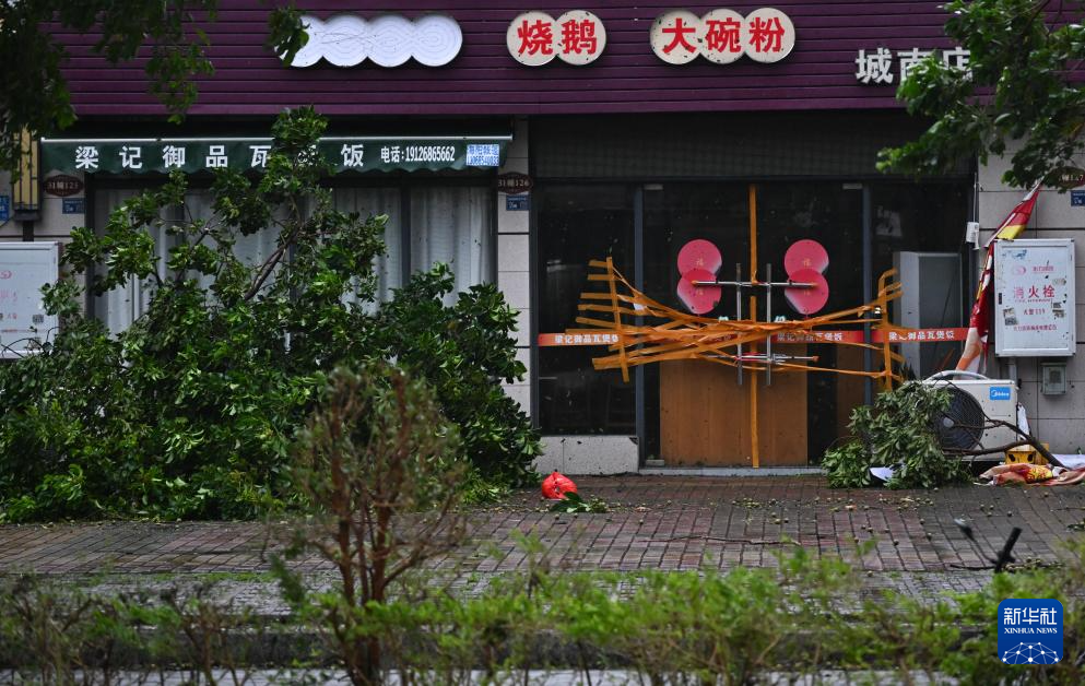 9月24日,在广东阳江市江城区横一路,被风吹断的树枝落在一家饭店门外。