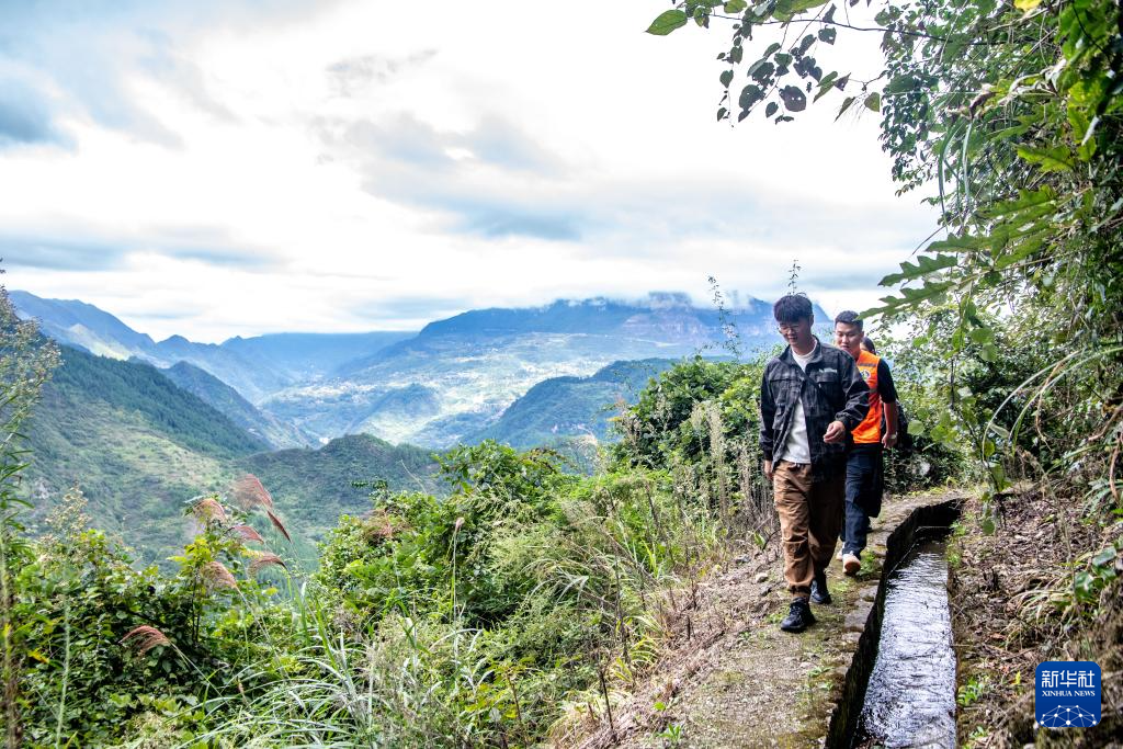 9月22日,管理中心工作人员通过悬崖上的水渠前往银杉群落监测样地。