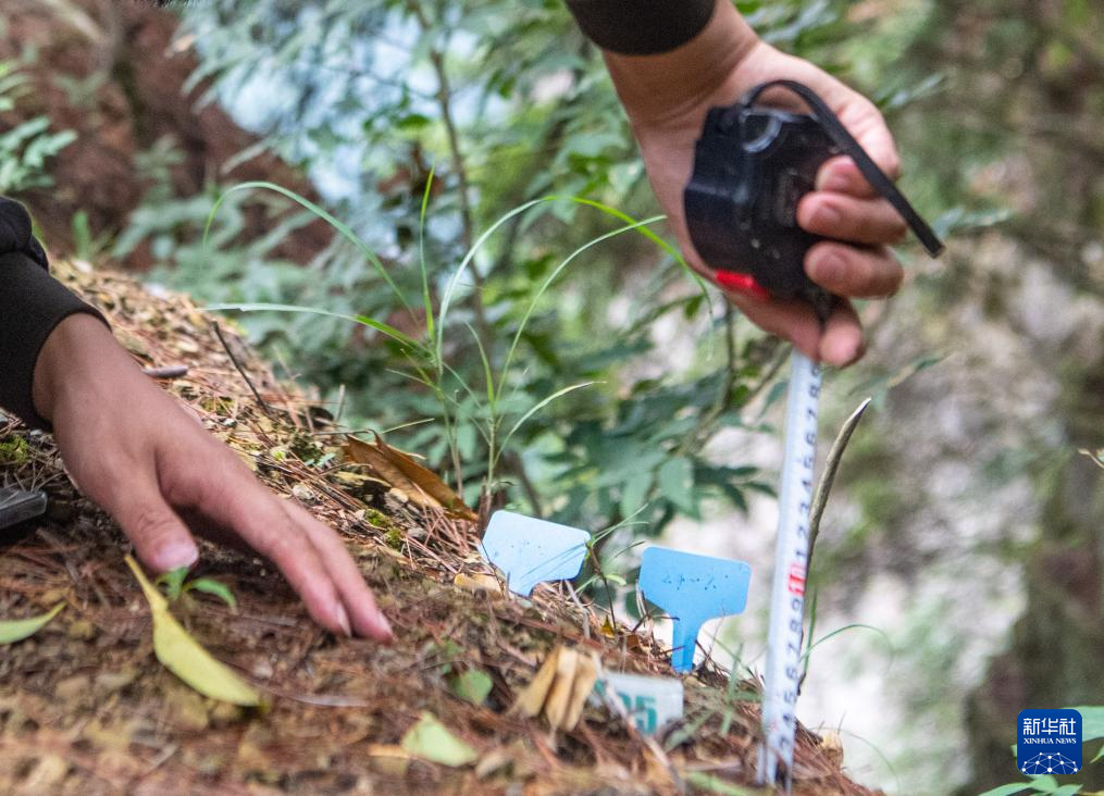 9月22日,在银杉群落监测样地,李新在记录野生银杉幼苗生长情况。