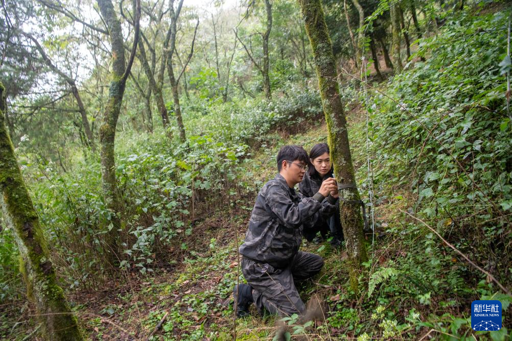9月23日,工作人员李新(左)、王泳鳗在安装红外相机。