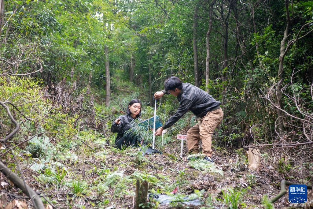 9月22日,在银杉幼苗野外回归地,李新(右)、王泳鳗在测量记录银杉幼苗生长情况。