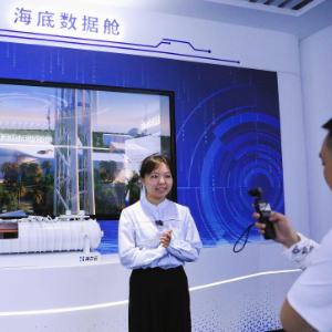 9月25日,一名记者在介绍海南海底数据中心的海底数据舱模型。