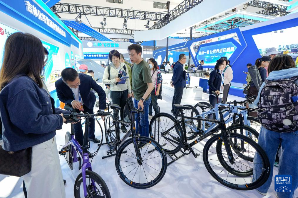 参观者在第十一届空军航空开放活动和长春航空展现场参观吉林化纤展出的碳纤维自行车(9月20日摄)。