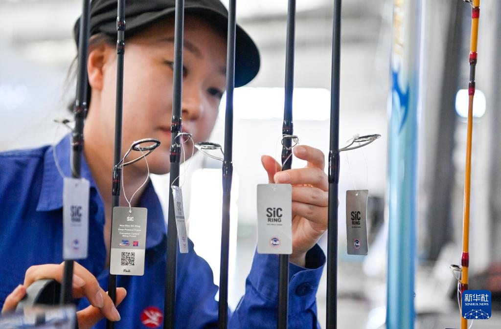 9月17日,鲍雨彤在吉林化纤集团国兴复材有限公司内展示碳纤维制作的钓鱼竿。