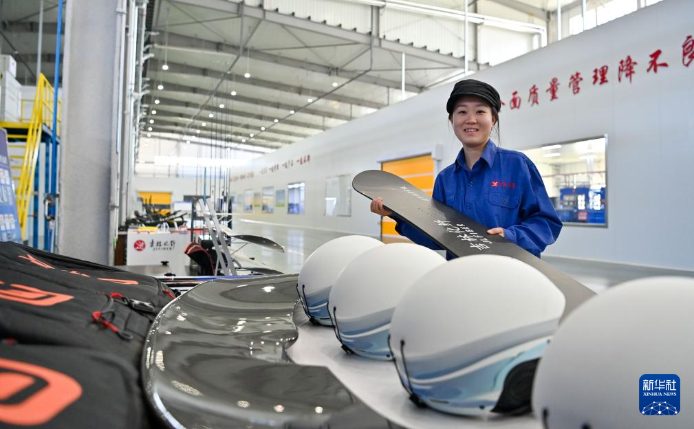 鲍雨彤在吉林化纤集团国兴复材有限公司内展示碳纤维制作的雪板和头盔(9月17日摄)。