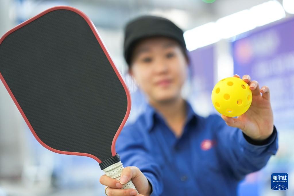鲍雨彤展示利用碳纤维制作的球拍(9月17日摄)。