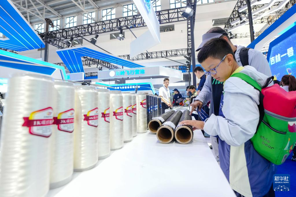 小朋友在第十一届空军航空开放活动和长春航空展现场参观吉林化纤展出的碳纤维织布(9月20日摄)。