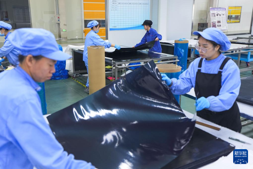 工作人员在吉林化纤集团国兴复材有限公司车间内加工碳纤维板材(9月17日摄)。