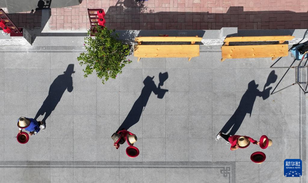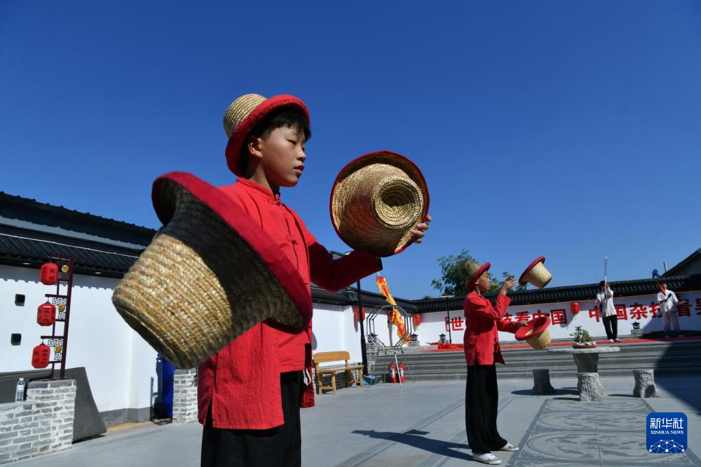 9月25日,河北省吴桥县桑园镇大第八村张硕杂技小院的学员在练习帽子技巧(无人机照片)。
