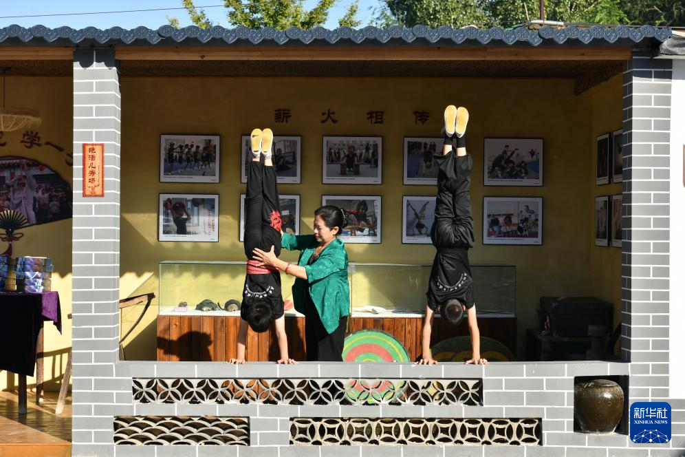 9月25日,河北省吴桥县桑园镇小第九村刁家班杂技小院的创建人刁桂华(中)在指导学员练习杂技基本功。